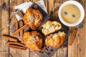 Breakfast with Cinnamon buns or rolls, Swedish Kanelbullar. wood